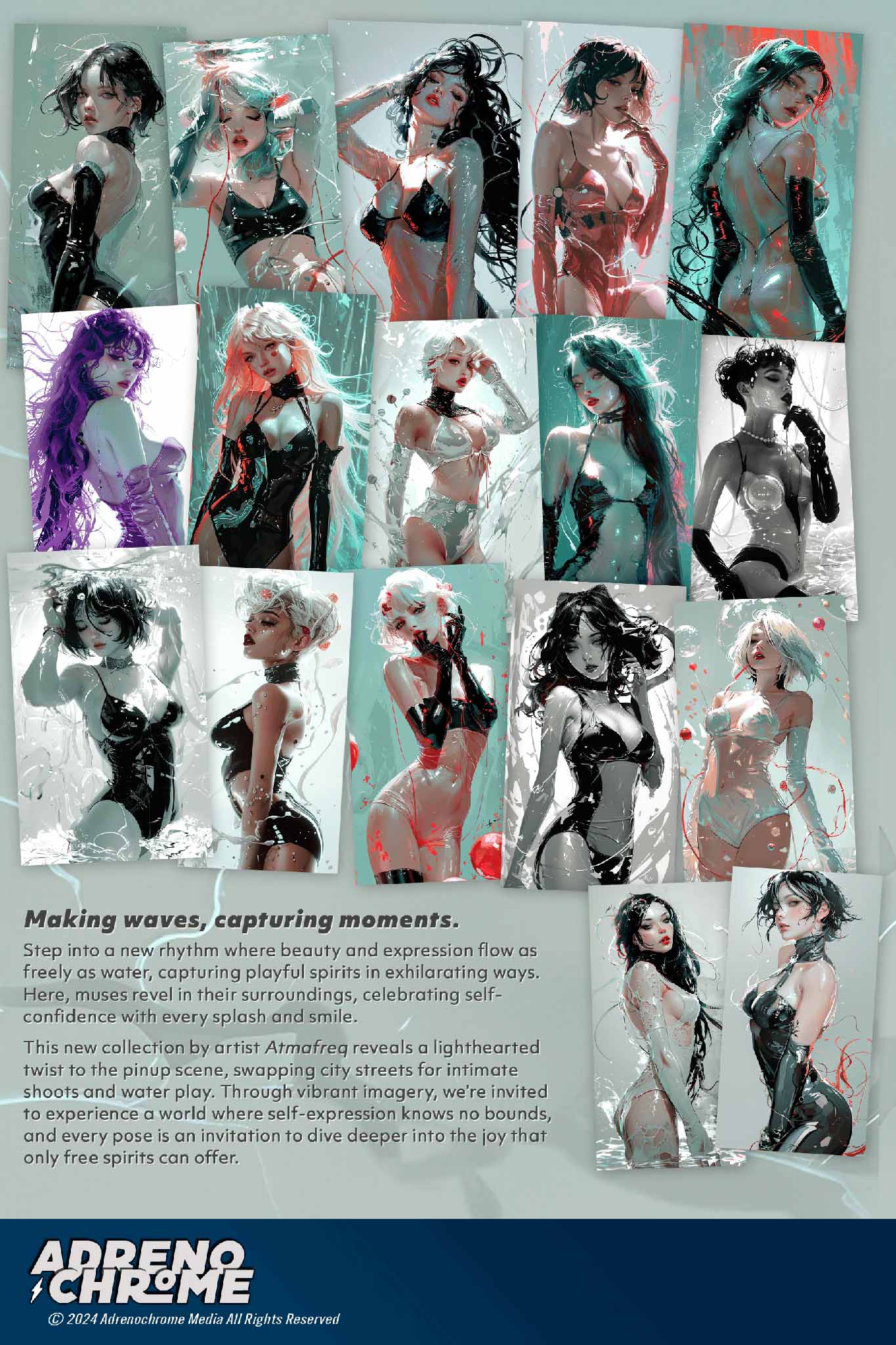 This new collection by artist Atmafreq reveals a lighthearted twist to the pinup scene, swapping city streets for intimate shoots and water play. Through vibrant imagery, we’re invited to experience a world where self-expression knows no bounds, and every pose is an invitation to dive deeper into the joy that only free spirits can offer.