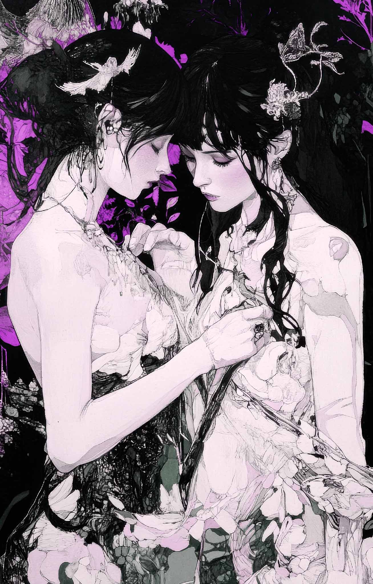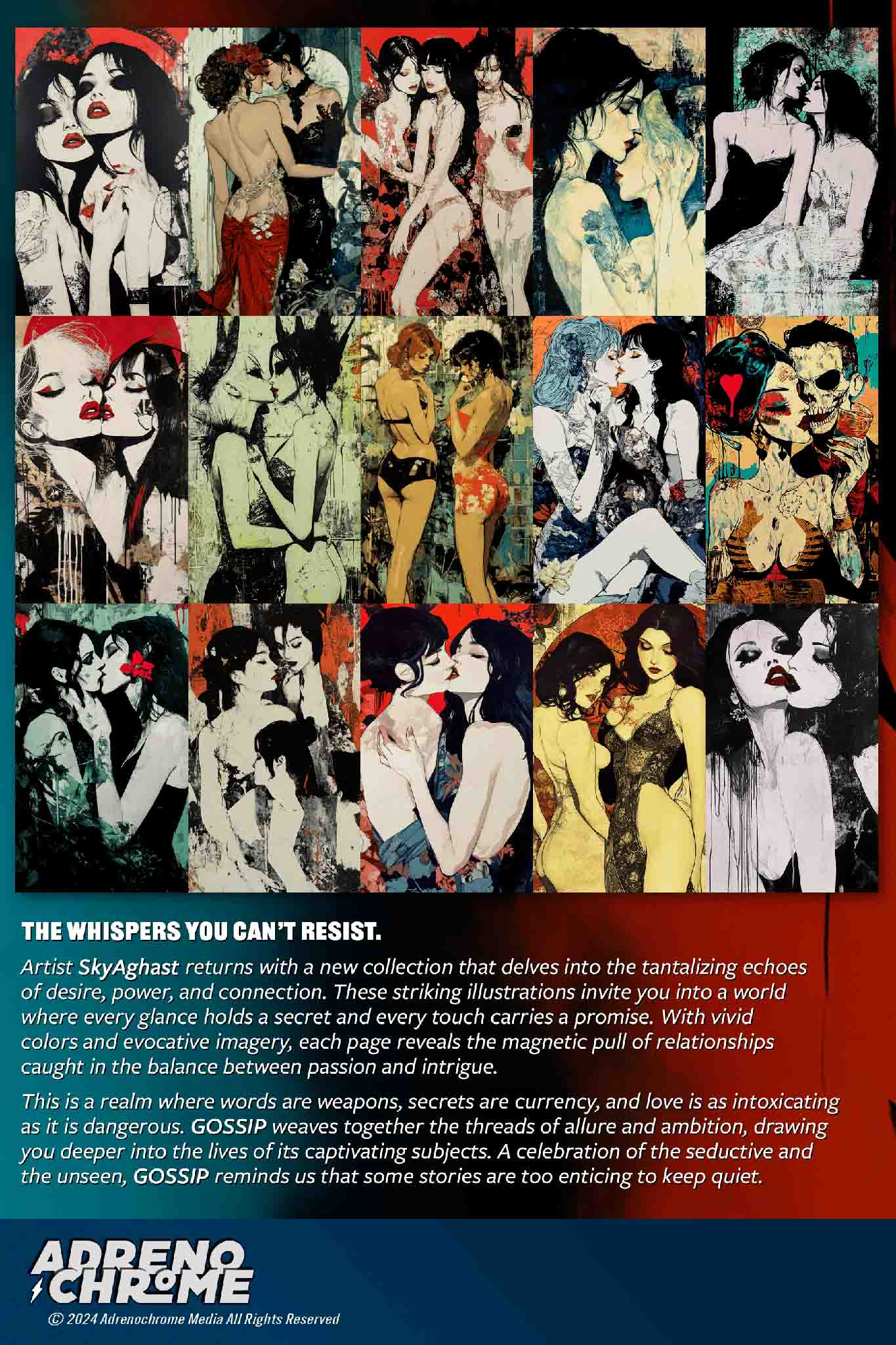 Artist SkyAghast returns with a new collection that delves into the tantalizing echoes of desire, power, and connection. These striking illustrations invite you into a world where every glance holds a secret and every touch carries a promise. With vivid colors and evocative imagery, each page reveals the magnetic pull of relationships caught in the balance between passion and intrigue.