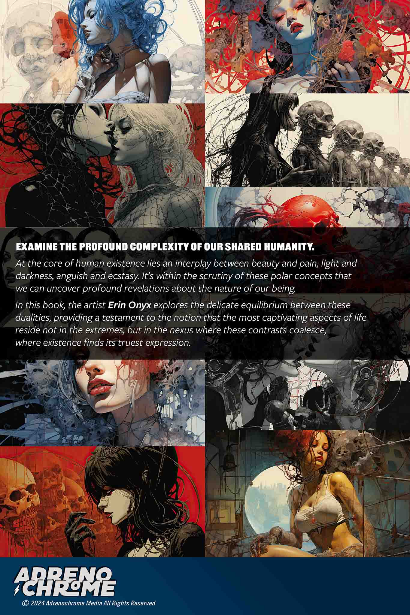 In this book, the artist Erin Onyx explores the delicate equilibrium between these dualities, providing a testament to the notion that the most captivating aspects of life reside not in the extremes, but in the nexus where these contrasts coalesce, where existence finds its truest expression.