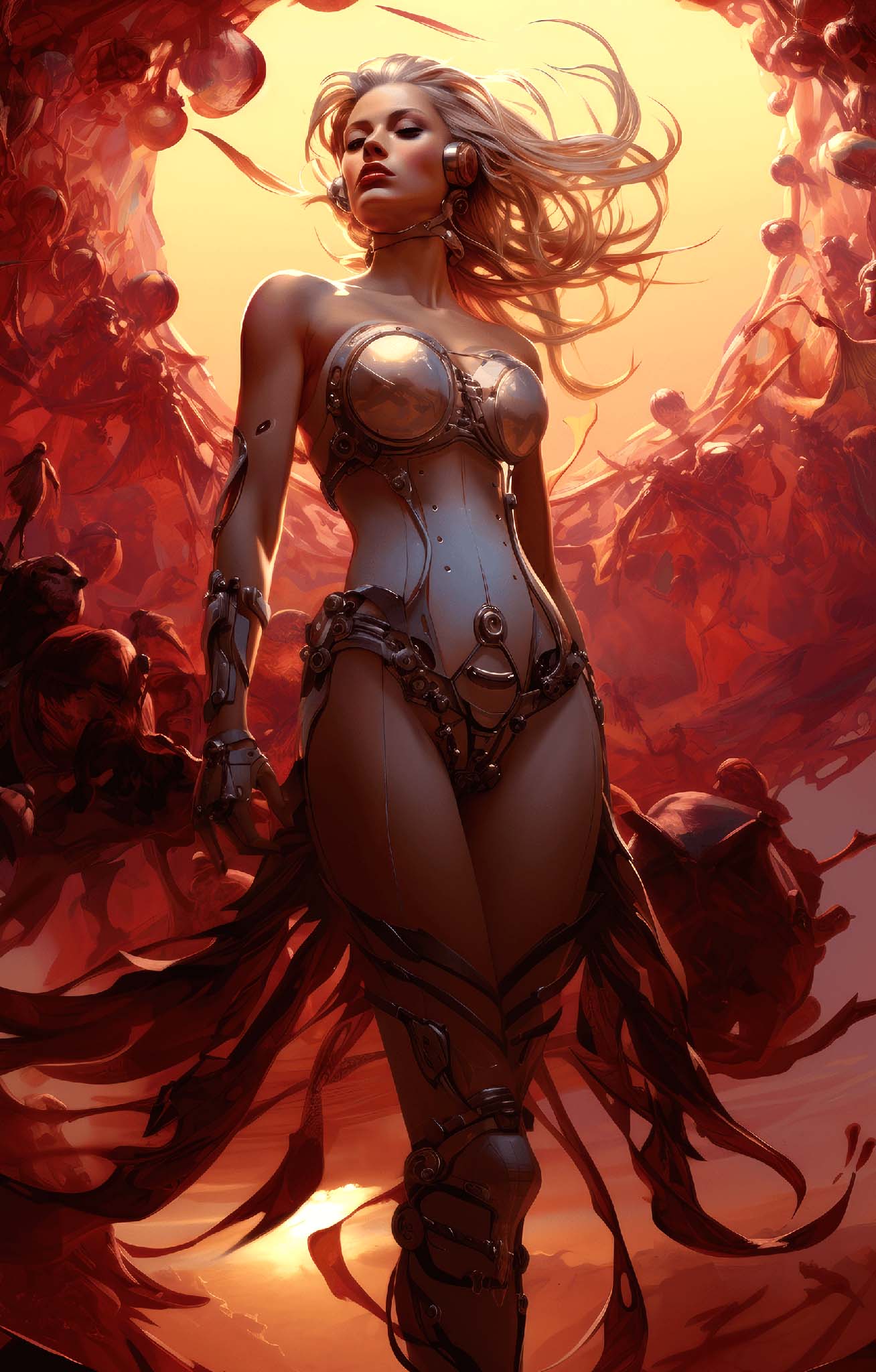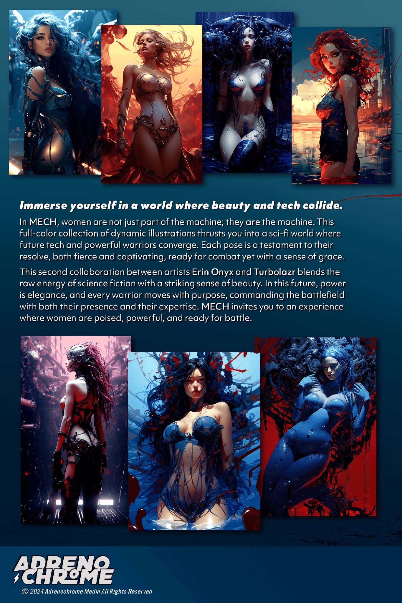 This second collaboration between artists Erin Onyx and Turbolazr blends the raw energy of science fiction with a striking sense of beauty. In this future, power is elegance, and every warrior moves with purpose, commanding the battlefield with both their presence and their expertise. MECH invites you to an experience where women are poised, powerful, and ready for battle.