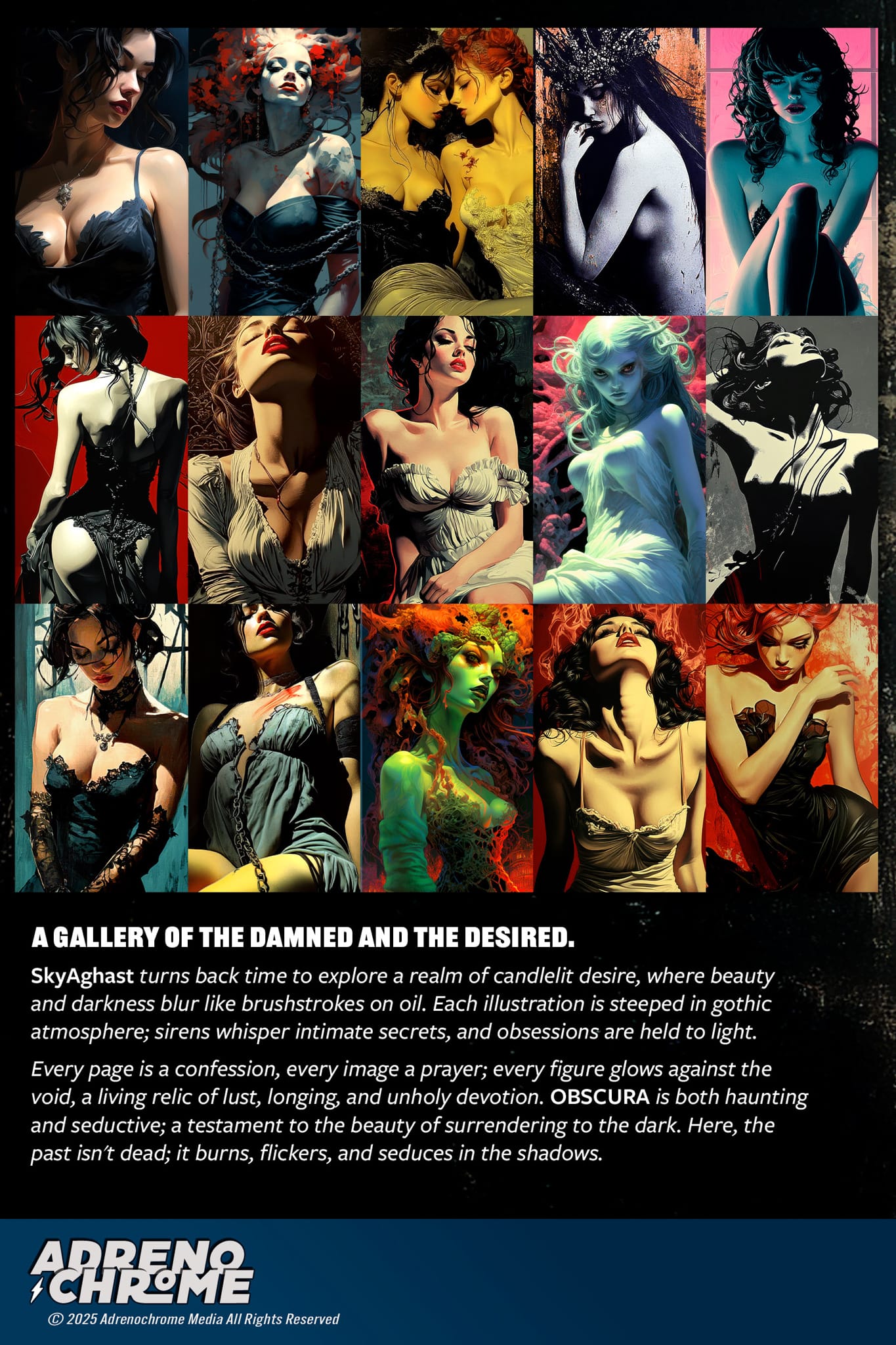 SkyAghast turns back time to explore a realm of candlelit desire, where beauty and darkness blur like brushstrokes on oil. Each illustration is steeped in gothic atmosphere; sirens whisper intimate secrets, and obsessions are held to light.